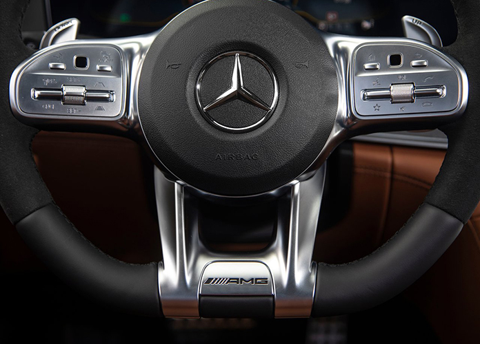 Vô lăng AMG bọc da Nappa kiểu D-Cut, tích hợp các nút điều khiển cảm ứng, mang đến cảm giác lái thể thao, đầy hứng khởi.